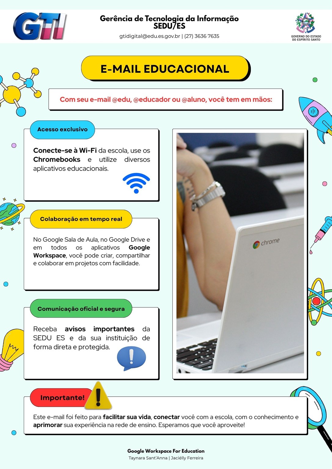 Seja muito bem-vindo(a) ao universo de possibilidades do seu e-mail educacional da SEDU ES! Ele é muito mais que um endereço; é a sua chave de acesso para tudo que você precisa no dia a dia. Aqui no site compartilharemos dicas, informações, aplicativos, segurança e muito mais. Pronto(a) para começar a explorar?